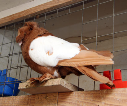 Kräftige, reichbefiederte Taube mit fast waagerechter Haltung, ausgeprägter Kopfstruktur, weißem Flügelschild und so freiem Stand, daß die gut ausgebildeten Latschen und Geierfedern sichtbar sind.
